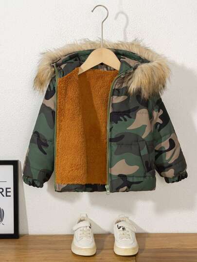 年轻男孩迷彩印花毛绒装饰连帽棉服外套(不含 T 恤) - 彩色 - 查看 1