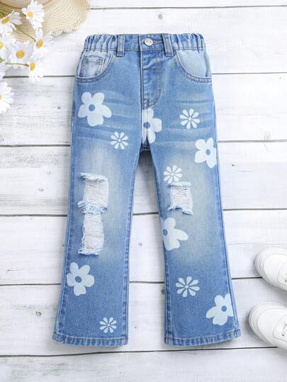 幼女破洞花卉印花寬腳牛仔褲 - 中等水洗藍 - 查看 1