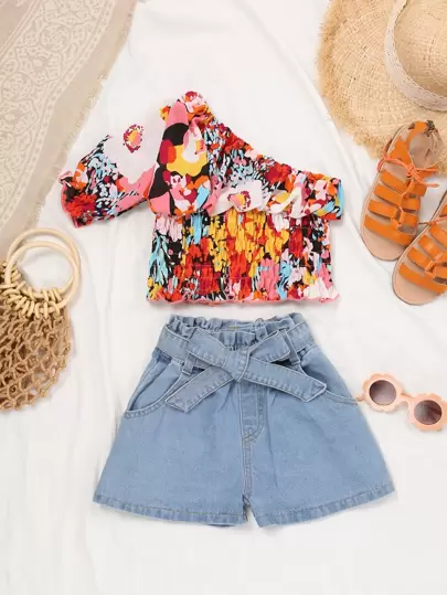 少女花朵印花單肩上衣和配腰牛仔效果短褲 - 彩色 - 查看 1