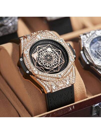 ONOLA 品牌 Iced Out 奢华钻石手表男士皮革防水石英手表礼物 - 黑色 - 查看 1