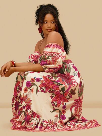 Travachic 大码热带印花露肩长裙 - 橘色 - 查看 1