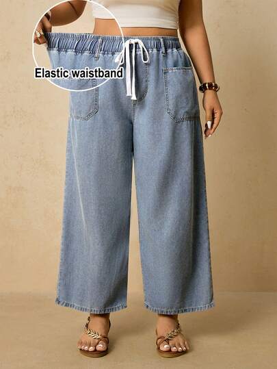 Travachic 大码女式宽松直筒牛仔裤,松紧腰带配抽绳,浅蓝色水洗直筒裤 - 淺色水洗藍 - 查看 1
