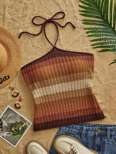 Travachic 女式条纹休闲挂脖针织上衣 - 紅色 - 查看 3