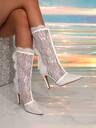 秋冬女士黑色蕾丝尖头高跟靴,时尚晚宴性感细高跟镂空中筒靴