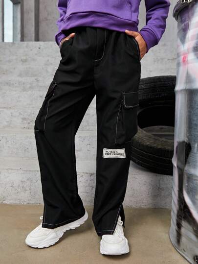 男大童字母補丁細節側翻蓋口袋下擺開叉長褲 - 黑色 - 查看 1