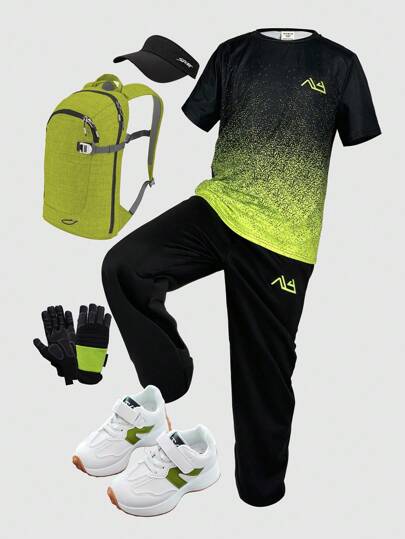 SHEIN 少年男童運動休閒圓領短袖T恤和束腳長褲套裝 - 黑色 - 查看 1