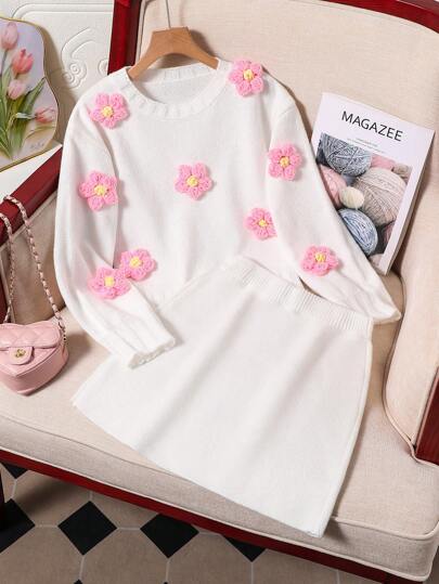 少女 2 件套 圆领长袖针织套装 带花卉图案 - 白色 - 查看 1