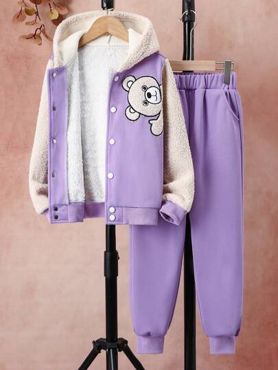 女大童小熊刺繡加絨內裏連帽夾克和運動褲 - 紫丁香色 - 查看 3