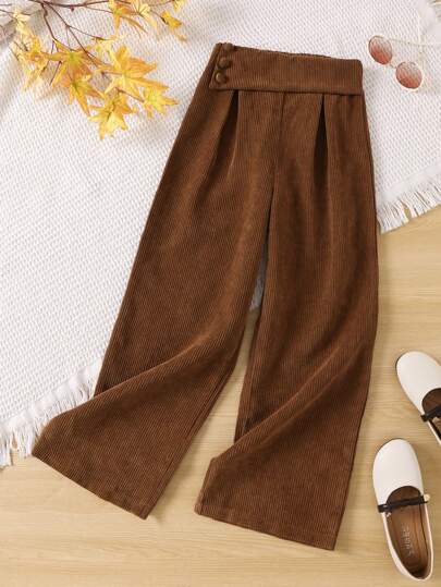 SHEIN 女大童紐扣細節闊腿褲 - 棕色 - 查看 1