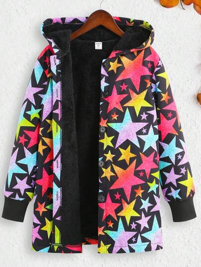 SHEIN 女大童星星印花毛絨內襯連帽外套 - 彩色 - 查看 1