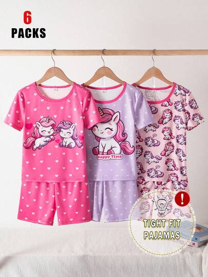 少女夏季圆领针织短袖短裤套装,趣味蓝紫马印花,时尚多色组合,6件套家居服睡衣套装