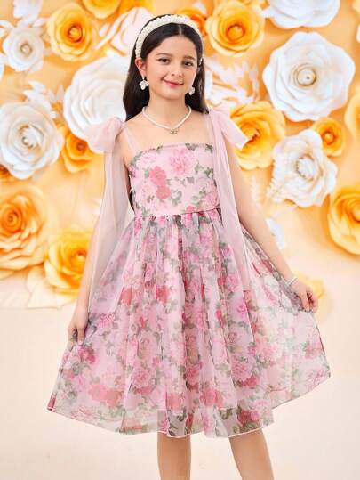 Tween 女童优雅花卉印花蝴蝶结装饰连衣裙 - 紫色 - 查看 1