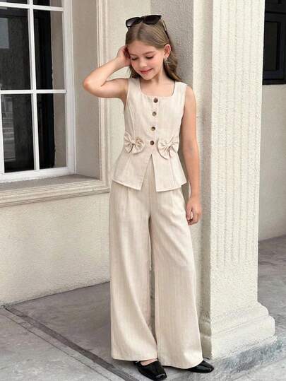 少女休闲优雅通勤街头时尚提花条纹3D蝴蝶结纽扣前襟无袖背心上衣和直筒裤套装 - 杏色 - 查看 1