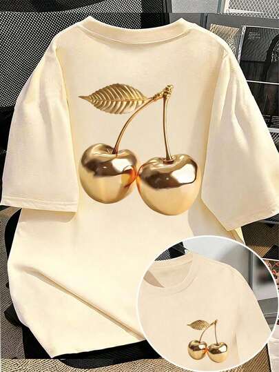 少女休闲印花圆领短袖T恤,夏季上衣 - 杏色 - 查看 10