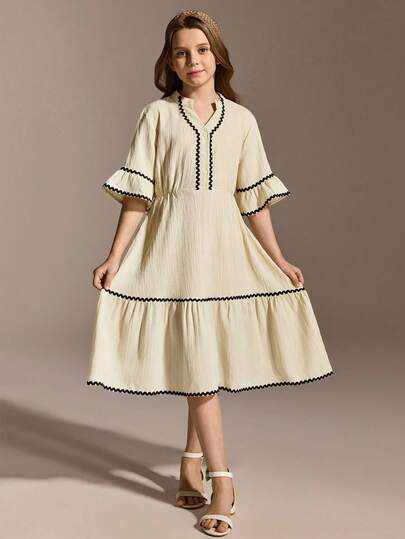 少女夏季休闲度假风V领撞色波浪纹饰带荷叶袖腰带连衣裙 - 杏色 - 查看 5
