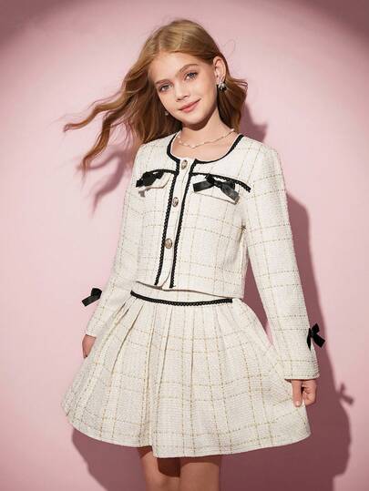 青少年女孩 T 恤套装,休闲优雅百搭,粗花呢夹克套装,搭配蝴蝶结夹克和迷你裙白色套装 - 白色 - 查看 1