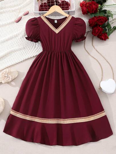 Tween 女童 V 领蕾丝拼接优雅短袖连衣裙 - 酒紅色 - 查看 1