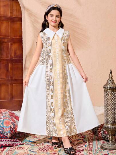 Tween 女童白色领口花卉印花拼接褶皱下摆修身连衣裙 - 彩色 - 查看 1