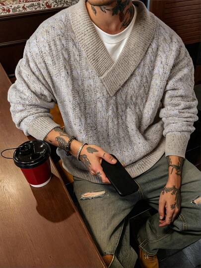 男女皆宜的休闲彩色波点抽绳麻花针织V领宽松毛衣,适合春、秋、冬季穿着。 - 駝色 - 查看 9