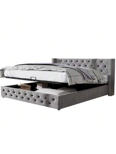 Upholstered Bed In An Ear Shape. Double Row Of Flannel Rivets, Buttoned Seams At The Head And Foot Of The Bed, Double Bed 140*200. Functional Hydraulic Bed. The Slatted Base Is Covered In Black, Stain-Resistant Fleece, Grey. - 灰色 - 查看 10