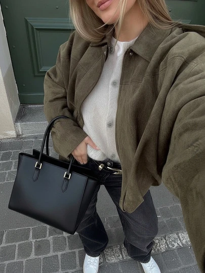 都市休闲纯色前拉链口袋夹克,宽松长袖飞行员夹克,适合春秋季 - 摩卡棕 - 查看 1