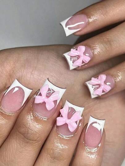 使用24入組短方形法式粉色蝴蝶結設計假指甲,讓您更加迷人。適用於派對、約會、跳舞和日常穿著。壓縮式指甲美容用品