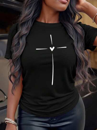 Maweii 大码休闲和心形印花短袖 T 恤,适合夏季 - 黑色 - 查看 1