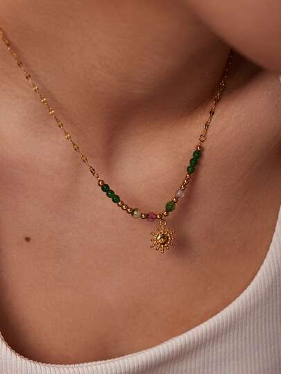 Uworld 1入18K鍍金時尚個性化太陽造型手工天然石項鏈,適合女性日常佩戴 - 彩色 - 查看 1