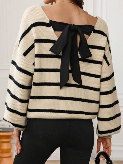 SHEIN LUNE 秋冬款 V 领露背系带条纹休闲办公女士保暖针织毛衣 - 彩色 - 查看 1