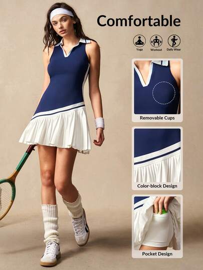 VARSIVA 女士撞色翻领褶皱荷叶边下摆无袖运动连衣裙配短裤 - 彩色 - 查看 10