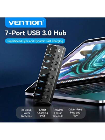 Vention Usb 3.0集線器,8個usb 3.0端口,7個歐式插頭,黑色美式插頭usb底座,帶有dc 12v / 2a電源適配器,type C轉usb擴展線適用於具有電源開關和dc 5.5毫米電源適配器的筆記型電腦pc - 黑色 - 查看 1