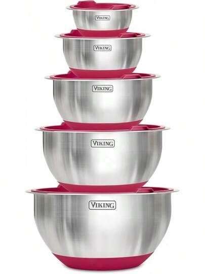 VIKING Mixing Bowls Set, 10 Piece Stainless Steel Kitchen Cookware, Non-Slip Silicone Base, Includes Tight Fit Lids, Dishwasher , Black