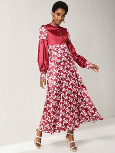 VIZLOOKS 设计师女士花卉印花灯笼袖优雅连衣裙,秋季除夕装,适合秋季、节日、派对 - 彩色 - 查看 1