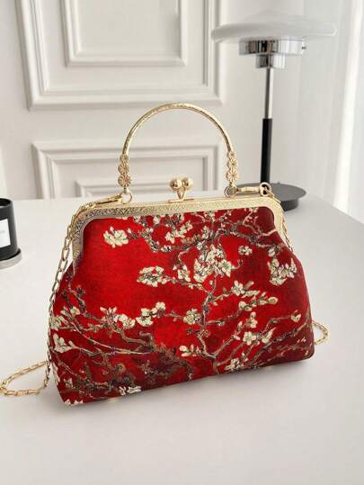 梵高杏花款休闲旗袍风手提包,中式百搭斜跨单肩手提包配金属扣,时尚女士手提包 - 紅色 - 查看 1