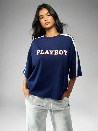 Missguided x Playboy 大学队品牌徽标超大 T 恤 - 藍白色 - 查看 1