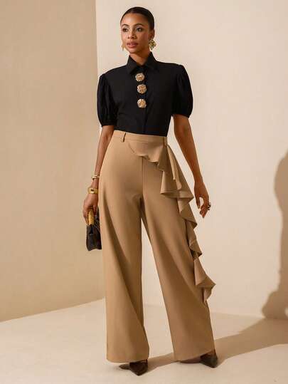 Vesra 女士优雅纯色荷叶边阔腿裤 - 卡其色 - 查看 1