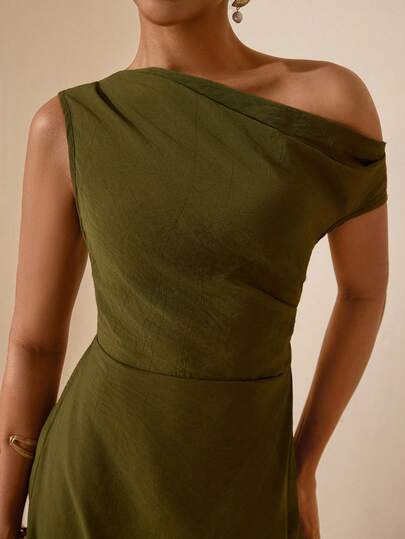 Vesra 女士纹理面料不对称肩部连衣裙 - 綠色 - 查看 1