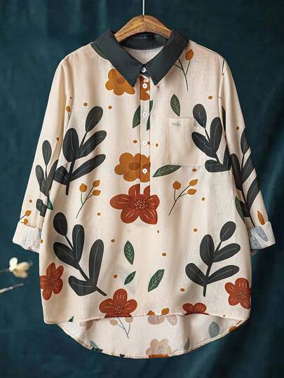 复古抽象花卉印花透气休闲亚麻衬衫,适合大码女士,百搭日常穿着
