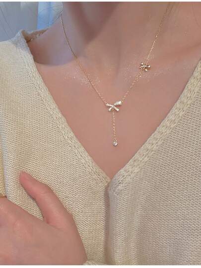 復古別緻鍍金鑲鑽蝴蝶結吊墜項鍊 - 小清新百搭金色鑲鑽蝴蝶結項鍊 - 查看 5