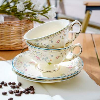 复古优雅宫廷风格陶瓷咖啡/牛奶杯碟套装,精致下午茶/办公室饮茶杯碟套装 - 彩色 - 查看 1