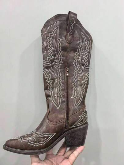 复古刺绣时尚舒适西部靴,新款侧拉链设计,防滑V型皮革,尖头设计,骑士靴,粗跟显瘦百搭休闲高筒靴,适合音乐节、万圣节等场合。 - 咖啡棕 - 查看 1