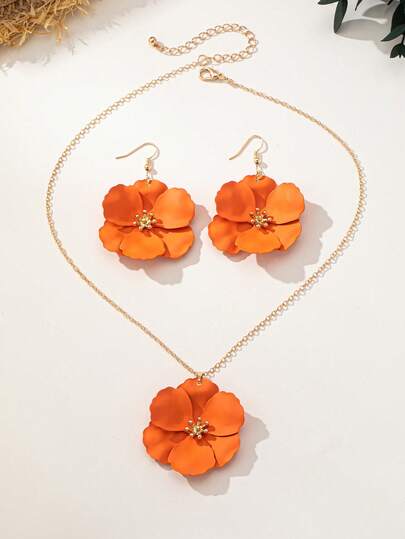 复古花卉项链耳环首饰套装,波西米亚风格花卉首饰,跨境时尚配饰 - 橘色 - 查看 1