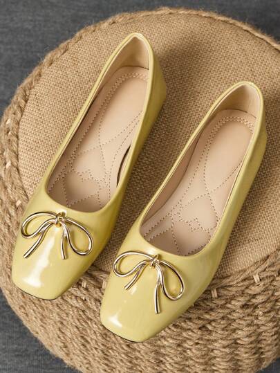 WHDXY 女士方头金属蝴蝶结平底鞋,软底舒适方头低帮鞋面百搭,适合喇叭裤办公室通勤,黑色,舒适不累脚 - 芥末黃 - 查看 1