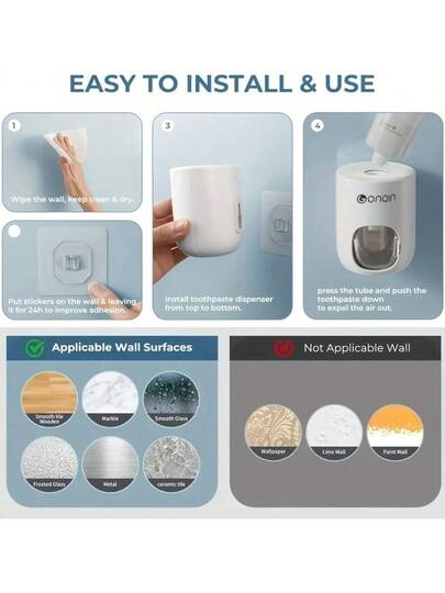 壁挂式牙膏分配器,带防尘罩,自动分配。适用于各种类型的牙膏,是家居和浴室的理想配件。安装无需钻孔。
