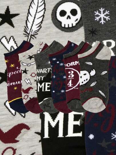 Warner Bros 6双随机春夏男女通用时尚哈利波特主题字母/数字图案百搭舒适透气撞色船袜 - 彩色 - 查看 6
