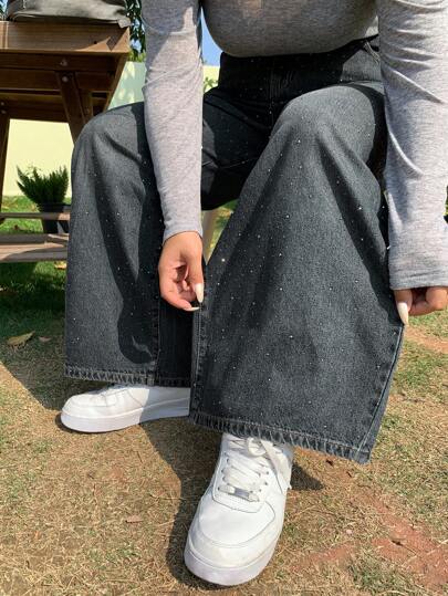 Dazy Plus 洗水复古牛仔女童直筒长牛仔裤,镶嵌闪亮水钻,适合所有季节 - 中等水洗藍 - 查看 1