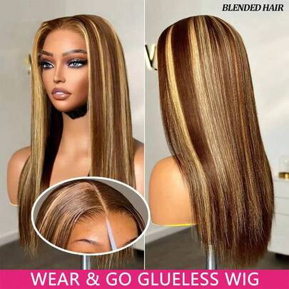 即戴即用无胶假发,真人前额发丝,预先拔毛,预先剪裁,5x5直发蕾丝前假发,混合发质,女士无胶假发,高清蕾丝前闭合,即戴即用假发,200%密度,28英寸,4/27蜂蜜金 - S4/27 - 查看 10