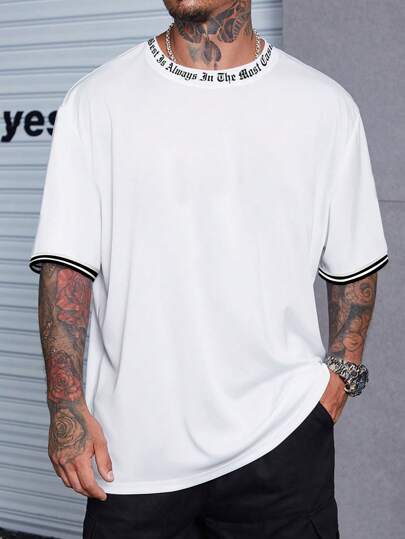 Manfinity Homme 男士大码標語圖案拼接邊T恤 - 白色 - 查看 1