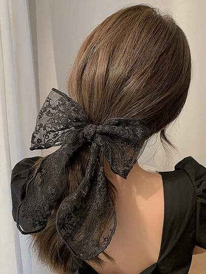 白色蕾丝蝴蝶结马尾夹,简约优雅的女孩发饰,爪夹发夹,发卡,上学用品,大学校园,蝴蝶结,可爱,高贵,冬季女装,发饰,头部饰品 - 黑色 - 查看 1