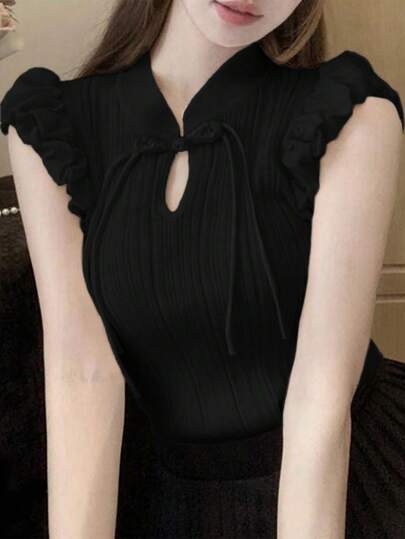 6. 女士极简主义中国风青蛙扣泡泡袖针织上衣夏季毛衣黑色
